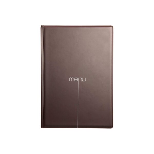 Portamenu con copertina rigida termosaldata per utilizzo professionale. Realizzato in cartoncino rivestito con PVC atossico di prima qualità, made in Italy e conforme alle normative CEE. Texture leggermente goffrata e ottima resistenza all’usura grazie alle doppie saldature del materiale. Contiene 4 buste trasparenti termosaldate sul dorso + 2 sul retro-copertina per un totale di 10 facciate visibili. Dimensioni esterne: 16,2 x 23,1 cm. Dimensioni foglio: 14,8 x 21 cm. Scritta “menu” serigrafata posizionata quasi centralmente sulla copertina.