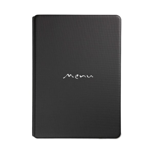 Portamenu con copertina rigida termosaldata per utilizzo professionale. Realizzato in cartoncino rivestito con PVC atossico di prima qualità , made in Italy e conforme alle normative CEE. Texture goffrata e ottima resistenza all’usura grazie alle doppie saldature del materiale. Contiene 6 buste trasparenti termosaldate sul dorso + 2 sul retro-copertina per un totale di 14 facciate visibili. Dimensioni esterne: 23,5 x 32,3 cm. Dimensioni foglio: 21 x 29,7 cm. Scritta “menu” serigrafata posta al centro della copertina. Colore copertina: nero.