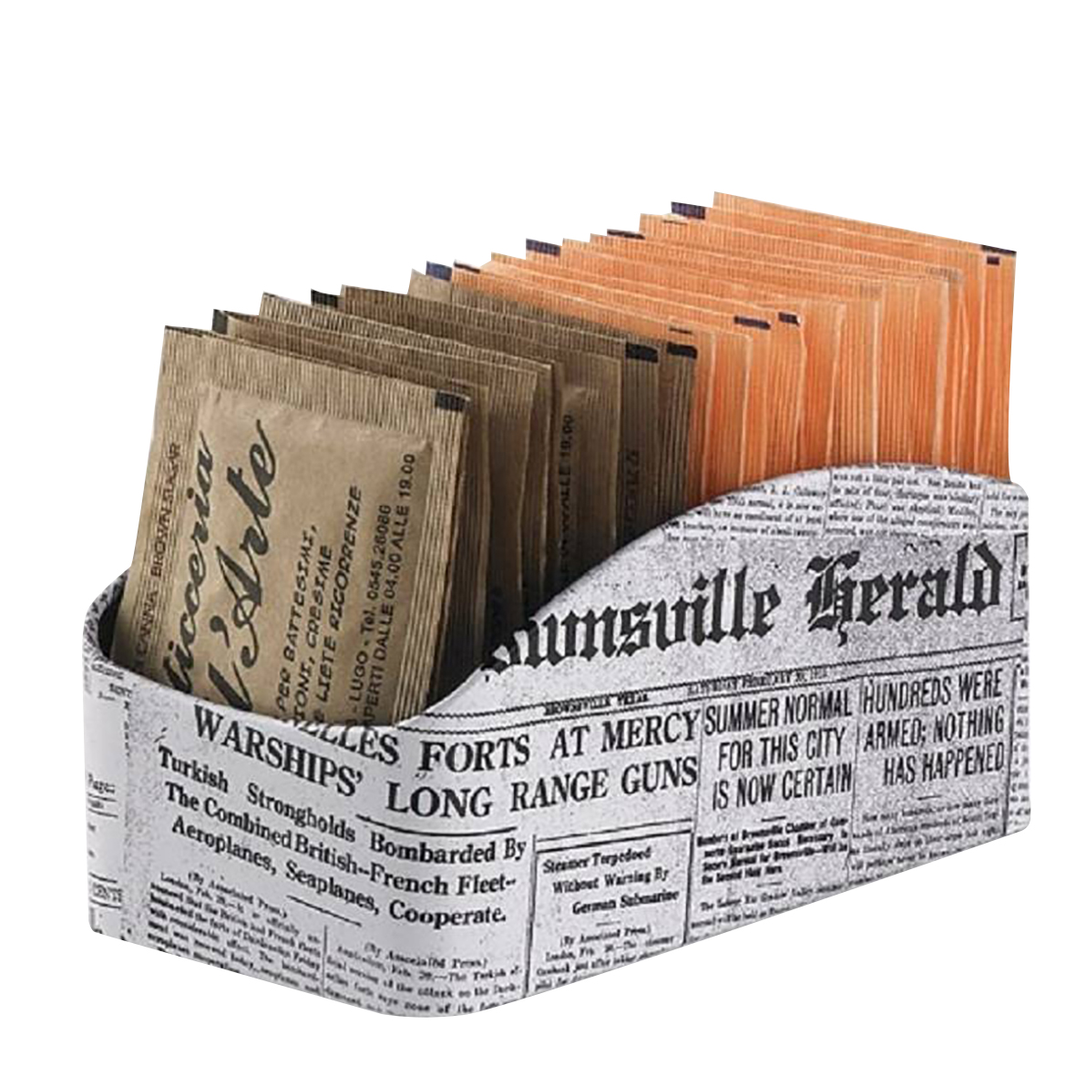 Portabustine zucchero in latta. Dimensioni: 11,2 x 6,2 x H 5,4 cm. Lavabile a mano. Colore: bianco e nero, fanstasia foglio di giornale.