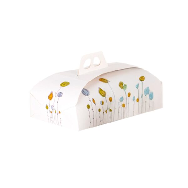 Pratico box porta dolci in cartoncino per alimenti, ideale per confezionare, trasportare e regalare le tue dolci creazioni. Colore: fondo bianco con fantasia a fiori disegnati colorati. Dimensioni: 18 x 26 cm. Idonea al contatto alimentare.