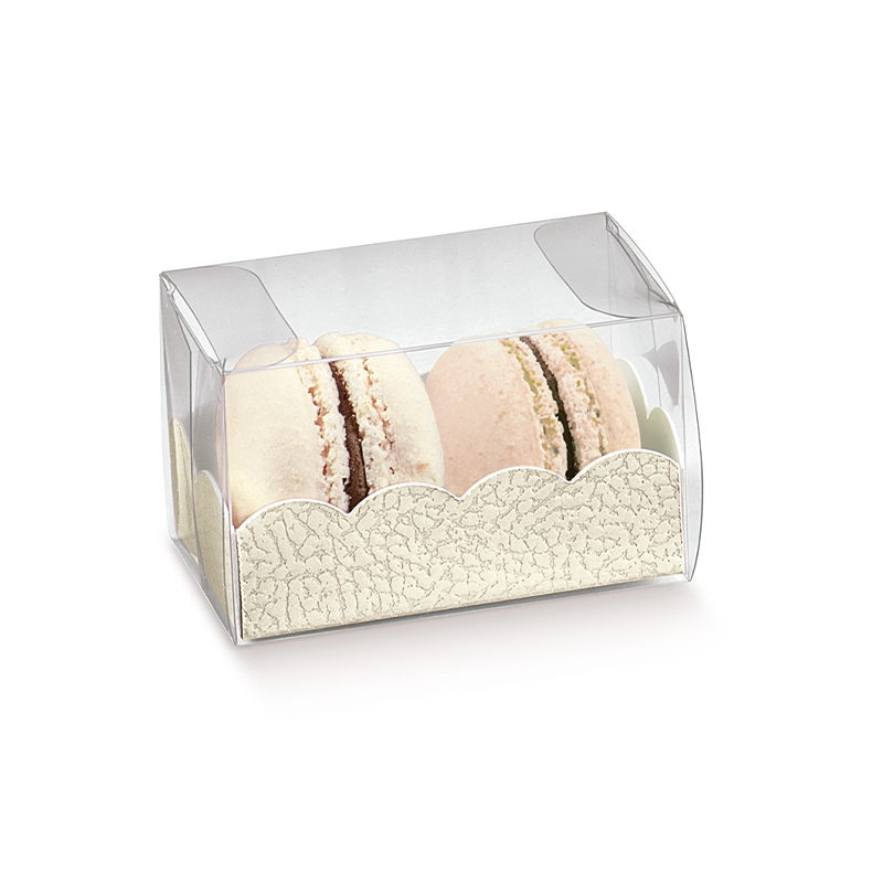 Astuccio trasparente con aperture laterali fornito con fondino goffrato esternamente e realizzato con cartoncino alimentare. Formati ideali per contenere macarons o dolcetti artigianali.