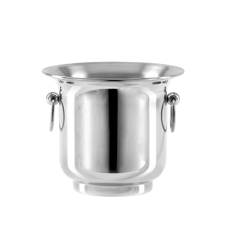 Secchiello in acciaio lucido con interno satinato e pomoli tondi cormati e anelli. Capacità di contenitmento: 1 bottiglia. Dimensioni: Ø sup. 20 cm, Ø inf. 13 cm, altezza 21 cm. Accessorio elegante e funzionale, indispensabile per mantenere al fresco vini, spumanti e altre bevande.