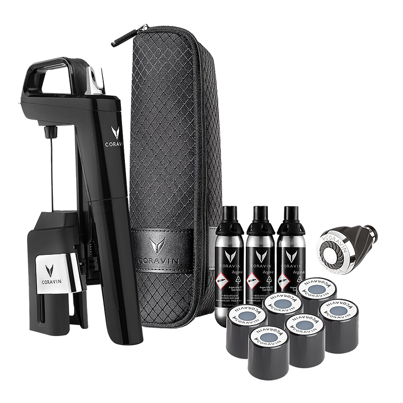 Incluso nella confezione sono: 1 dispositivo Timeless Six+, 1 Aeratore Timeless, 3 capsule di gas argon Coravin Pure, 6 tappi a vite, 1 custodia di trasporto Timeless e 1 strumento di pulizia per l’ago. Dimensioni: 10 x 5 x 21,5 cm.