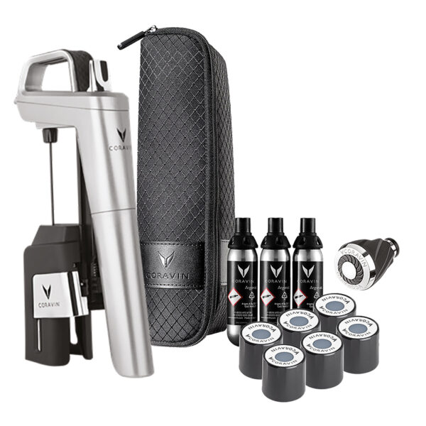 Incluso nella confezione sono: 1 dispositivo Timeless Six+, 1 Aeratore Timeless, 3 capsule di gas argon Coravin Pure, 6 tappi a vite, 1 custodia di trasporto Timeless e 1 strumento di pulizia per l’ago. Dimensioni: 10 x 5 x 21,5 cm.
