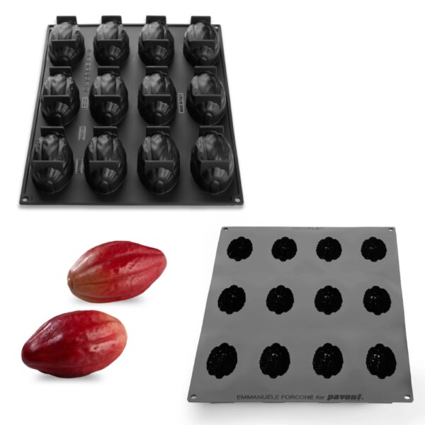 Lo stampo Cabosse della linea Pavoflex 400×300 di Pavoni è progettato per la pasticceria professionale e consente di realizzare dessert monoporzione tridimensionali dall’elevato impatto estetico. Il design riproduce in modo realistico la forma del baccello di cacao, ideale per creazioni moderne e presentazioni curate. Pensato per la produzione di monoporzioni, garantisce precisione e uniformità, ottimizzando tempi e risultati in laboratorio. Le 12 cavità da circa 120 ml, con dimensioni 96 x 55 x H 45 mm, permettono una lavorazione efficiente e standardizzata, mentre il formato 400 x 300 mm si integra perfettamente negli ambienti professionali. Realizzato in silicone platinico 100% conforme alle normative UE, è atossico, inodore e insapore, garantendo sicurezza alimentare e affidabilità anche a temperature elevate; il materiale assicura ottime prestazioni nel tempo, mantenendo precisione nei dettagli e resistenza all’usura. VANTAGGI: – atossico, inodore e insapore; – flessibile e salvaspazio; infrangibile e resistente; – utilizzabile da -40°C a +250°C; versatile, consente il passaggio da abbattitore a forno senza attese; – lavabile in lavastoviglie. UTILIZZO: Adatto per preparazioni dolci e salate, può essere impiegato in forno, microonde, frigorifero, freezer e abbattitore. La naturale antiaderenza facilita la sformatura, garantendo risultati precisi e riducendo i tempi di lavorazione. PRECAUZIONI: – lavare in lavastoviglie evitando prodotti abrasivi o detergenti aggressivi; – non utilizzare coltelli o oggetti taglienti a contatto con lo stampo; – non esporre a fonti di calore diretto come fuoco, grill, vetroceramica o piastre elettriche; – non utilizzare la funzione CRISP del microonde.