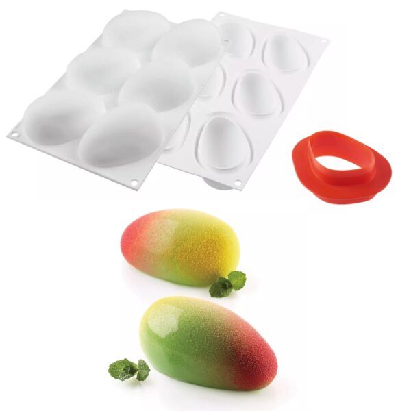 Stampo professionale in silicone alimentare per la realizzazione di dessert monoporzione 3D a forma di mango. Dotato di 6 cavità da 130 ml ciascuna (totale 780 ml), con dimensioni singola cavità circa 93 x 57 x H 42 mm. Ideale per pasticceria moderna e preparazioni creative. Resistente a temperature da -60°C a +230°C, è adatto per forno, microonde, frigorifero, abbattitore e congelatore. Lavabile in lavastoviglie, garantisce massima flessibilità e facilità di sformatura.