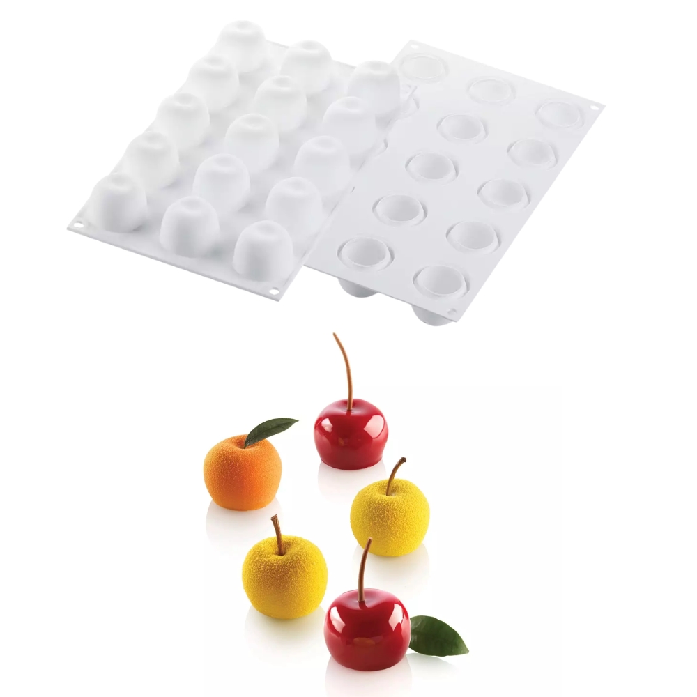 Stampo professionale in silicone alimentare per la realizzazione di dessert monoporzione 3D a forma di mela, ciliegia e pesca. Dotato di 15 cavità da 30 ml ciascuna (totale 450 ml), con dimensioni singola cavità Ø 39 x H 30 mm. Ideale per pasticceria moderna, mignon e finger dessert. Resistente a temperature da -60°C a +230°C, è adatto per forno, microonde, frigorifero, abbattitore e congelatore. Lavabile in lavastoviglie, garantisce massima flessibilità e facilità di sformatura.