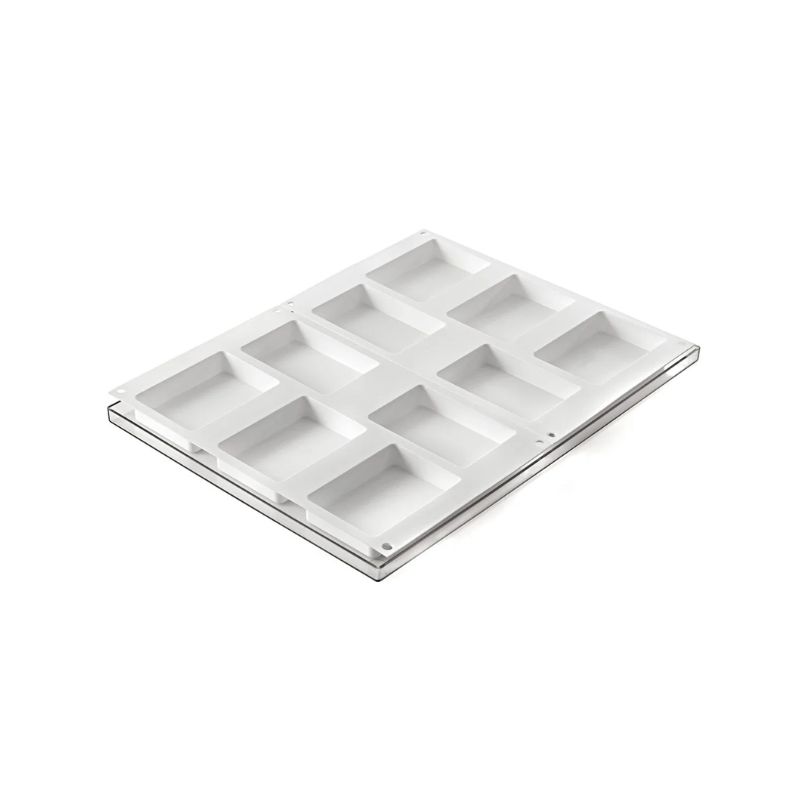 Dimensioni: 68 x 99 x H 20 mm. Volume: 5 x 134 ml. Set da 2 stampi in silicone con vassoio 30 x 40 cm.