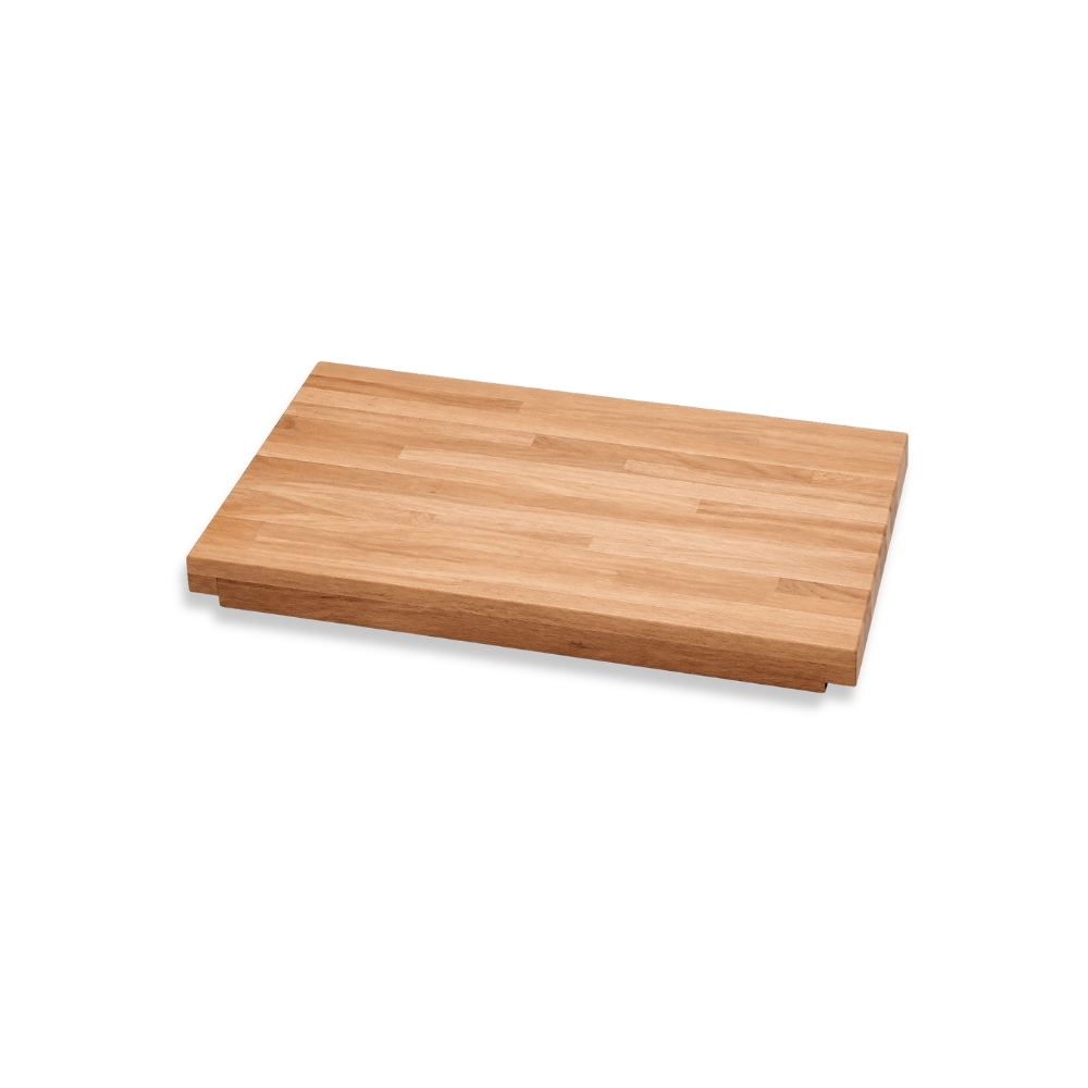 Tagliere professionale in legno di faggio lamellare listellato con fermi laterali. Superficie resistente e stabile, ideale per lavorazioni quotidiane in cucina e laboratorio. Altezza: 3,2 cm.