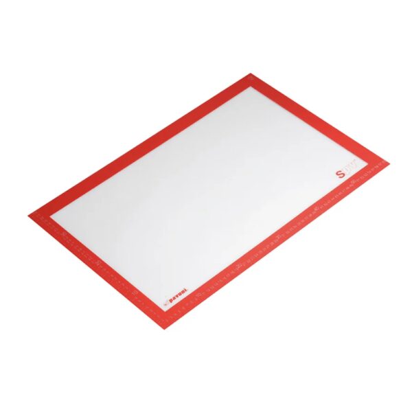 Tappetino antiaderente in silicone adatto sia per la cottura che la surgelazione di prodotti da pasticceria, gelateria, ristorazione e per l’industria dolciaria in genere. Realizzato in tessuto di vetro rivestito da silicone alimentare su entrambi i lati. Può essere utilizzato a temperature da -40°C a +250°C. Dimensioni: 58,5 x 38,5 cm.