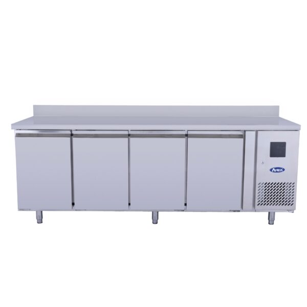 Tavolo frigorifero 700 TN 4 porte GN 1/1 con alzatina. Tropicalizzato. Con alzatina e top in acciaio AISI 304. Dimensioni: 223 x 70 x H 85 cm. Capacità lorda: 560 lt. Temperatura: -2°C/+8°C.