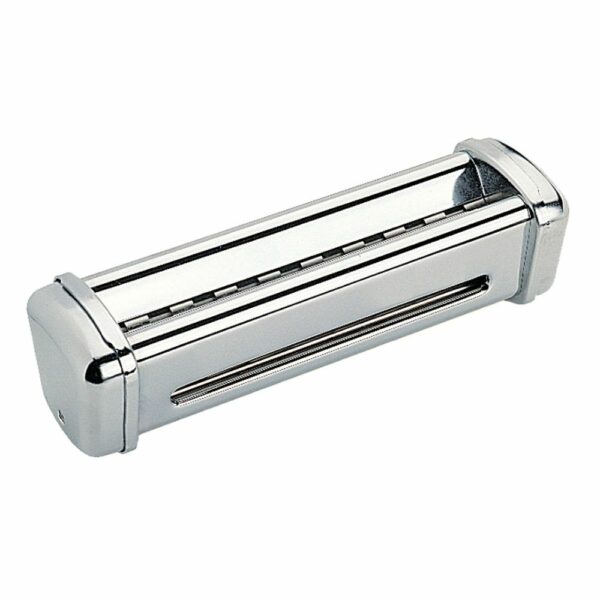 Accessorio da taglio adattabile a tutte le macchine della gamma Imperia Pasta Restaurant. Realizzato in robusto acciaio inossidabile, è progettato per una facile pulizia e un uso prolungato. Taglia precisamente la pasta a 12 mm, creando un bordo elegante e leggermente ondulato che è caratteristico delle Reginette o lasagnette ricce. Questa forma di pasta è eccellente per trattenere sia sughi leggeri che ricchi.