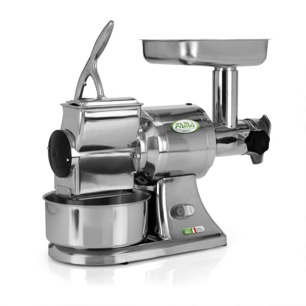Macchinario per uso professionale, costruito in lega di alluminio pressofuso. Elegante fascia in acciaio inossidabile sulla carcassa motore. Sistema di riduzione ad ingranaggi elicoidali a bagno d’olio. Motore asincrono produzione nazionale. Termica di protezione. Gruppo macinazione carne in ghisa alimentare. Trafile auto affilanti in acciaio inox di serie. Tramoggia e piatto raccolta prodotto in acciaio inox. Rullo in acciaio con trattamento electroless nikel plating. Scodella formaggio in acciaio inox. Grata di protezione allo scarico bocca grattugia inox. Micro di protezione alla grattugia. Pestello in ABS. Comandi a 24 volt. Conforme alle norme CE. Fabbricato in Italia. Dimensioni prodotto: 200 x 550x H 460 mm. Alimentazione: 230 V/ 50 Hz. Monofase. Potenza (Kwatt/Hp): 0,75 (1,00). Giri/m tritacarne (RPM): 200. Giri/m grattugia (RPM): 1400. Produzione oraria tritacarne (kg): 200. Produzione oraria grattugia (kg): 50. Bocca d’uscita tritacarne: Ø 70 mm. Bocca grattugia: 140 x 80 mm. Piastra in dotazione: Ø 6 mm. Peso netto: 22 kg.