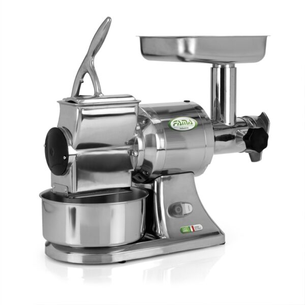 Macchinario per uso professionale, costruito in lega di alluminio pressofuso. Elegante fascia in acciaio inossidabile sulla carcassa motore. Sistema di riduzione ad ingranaggi elicoidali a bagno d’olio. Motore asincrono produzione nazionale. Termica di protezione. Gruppo macinazione carne in ghisa alimentare. Trafile auto affilanti in acciaio inox di serie. Tramoggia e piatto raccolta prodotto in acciaio inox. Rullo in acciaio con trattamento electroless nikel plating. Scodella formaggio in acciaio inox. Grata di protezione allo scarico bocca grattugia inox. Micro di protezione alla grattugia. Pestello in ABS. Comandi a 24 volt. Conforme alle norme CE. Fabbricato in Italia. Dimensioni prodotto: 200 x 550x H 460 mm. Alimentazione: 230 – 400 V/ 50 Hz. Trifase. Potenza (Kwatt/Hp): 0,75 (1,00). Giri/m tritacarne (RPM): 200. Giri/m grattugia (RPM): 1400. Produzione oraria tritacarne (kg): 200. Produzione oraria grattugia (kg): 50. Bocca d’uscita tritacarne: Ø 70 mm. Bocca grattugia: 140 x 80 mm. Piastra in dotazione: Ø 6 mm. Peso netto: 20 kg.