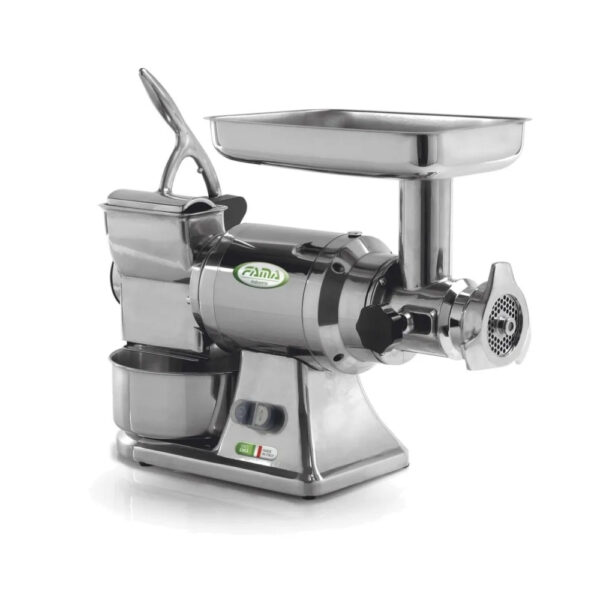 Macchinario per uso professionale, costruito in lega di alluminio pressofuso. Elegante fascia in acciaio inossidabile sulla carcassa motore. Sistema di riduzione ad ingranaggi elicoidali a bagno d’olio. Motore asincrono produzione nazionale. Termica di protezione. Gruppo macinazione carne in ghisa. Trafile auto affilanti in acciaio inox di serie. Tramoggia e piatto raccolta prodotto in acciaio inox. Rullo in acciaio con trattamento electroless nikel plating. Scodella formaggio in acciaio inox. Grata di protezione allo scarico bocca grattugia inox. Micro di protezione alla grattugia. Pestello in ABS. Comandi a 24 volt. Conforme alle norme CE. Fabbricato in Italia. Dimensioni: 220 x 610 x H 460 mm. Monofase. Alimentazione: (Volt/Hz) 230/50. Potenza (Kwatt/Hp): 1,10 (1,50). Giri/m tritacarne (RPM): 140. Giri/m grattugia (RPM): 900. Produzione oraria tritacarne: 300 kg. Produzione oraria grattugia: 70 kg. Bocca d’uscita tritacarne: Ø 82 mm. Bocca grattugia: 140 x 80 mm. Piastra in dotazione: Ø 6 mm. Peso netto: 27 kg.
