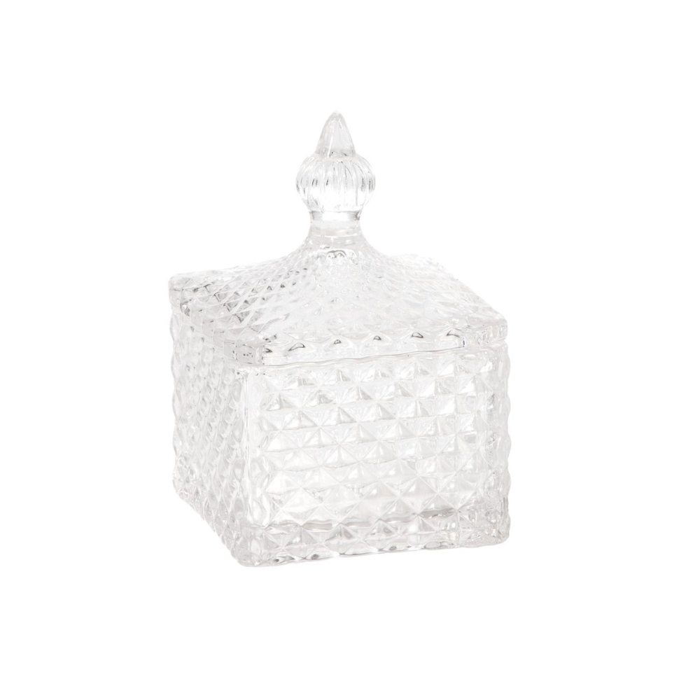 Barattolo in vetro con coperchio. Dimensioni: 8 x 8 x H 11,5 cm.